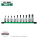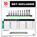 The MILWAUKEE® 10PC 3/8" Drive TORX Bit Socket Set with FOUR FLAT™ sides is designed from the ground up to be part of the most versatile socket family. Milwaukee® bit sockets feature an innovative design with four parallel flat sides, which deter rolling and are wrench-compatible. This also creates a slim profile to provide the best access in tight spaces. The one-piece socket design offers improved durability compared to two-piece designs by eliminating the risk of the bit separating from the socket base. This set includes a storage rail for better organization. Laser engraved size markings provide easy identification and chrome plating offers rust and corrosion protection. All Milwaukee® bit sockets are backed by a Lifetime Guarantee.