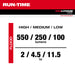 • Three light output modes: High mode: 550 lumens- 2.0 hours; Medium mode: 250 lumens- 4.5 hours; Low mode: 100 lumens- 11.5 hours