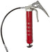 This Alemite 555-E pistol grip grease gun, which comes with a flexible extension, has a cylinder capacity of 16 oz., and delivers lubricant at pressures up to 7,500 pounds per square inch (psi) at a rate of 1 oz. per 30 strokes in high-volume mode. A dual mode, pistol grip lever mechanism makes it possible to choose either high-volume output or high-pressure delivery. This grease gun loads grease either by bulk loading or inserting a grease cartridge. The follower has a heavy-duty spring to keep the grease gun primed, and a bleeder valve keeps the grease gun from building up excessive pressure in the cylinder. This grease gun injects grease into standard grease fittings and is suitable for applications such as lubricating motor vehicles, construction and industrial equipment, and aeronautics. Oil and grease guns are handheld tools that inject lubricant (dispensed from the barrel or cylinder cartridge) into metal mechanical assemblies. Electric and air-powered grease guns can dispense large volumes of lubricant in commercial applications, while battery-powered (cordless) grease guns are more suitable for mobile and remote applications. Manual grease guns (lever, pistol-grip, screw-type, push-type, and suction) vary in duty and have either a rigid or flexible hose extension for attaching nozzles or a nozzle with coupler for standard grease fittings.