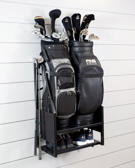 A great solution for organizing your golf bag and clubs. This golf bag holder will securely hold two standard golf bags, along with 2 individual cl...